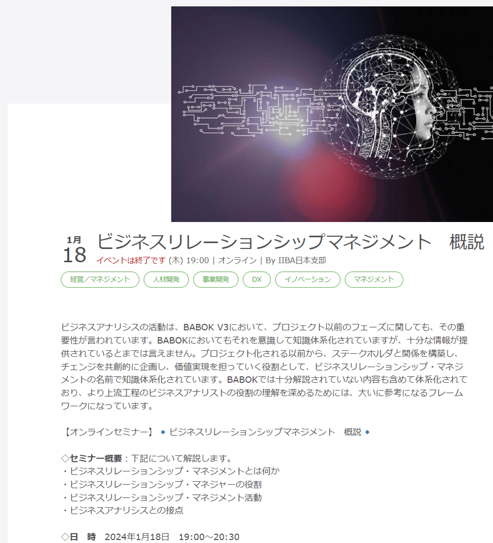 弊社代表の塩田が、IIBA日本支部様主催のセミナーにおいて、BRM Instituteの支援も得ながら、ビジネスリレーションシップマネジメント(BRM)に関するセミナーを開催しました。